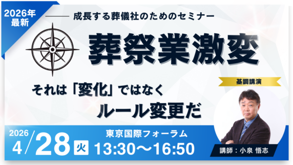 はじめまして。本セミナーで基調講演「葬祭業激変、変化ではなくルール変更!!」を担当する、小泉です。近年、葬儀業界では「件数が減っている」「単価が下がっている」「競争が激しくなっている」といった声を多く耳にします。しかし、現場で数多くの葬儀社...